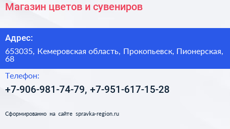 Магазин цветов и сувениров по адресу 653035, Кемеровская область, Прокопьевск, Пионерская, 68 в дальнейшем Организация, размещена в следующих категориях: