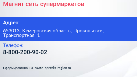 Магнит, сеть супермаркетов по адресу 653013, Кемеровская область, Прокопьевск, Транспортная, 1 в дальнейшем Организация, размещена в следующих категориях: