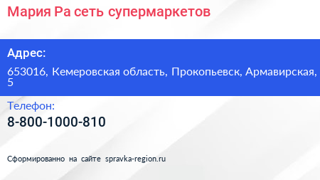 Мария-Ра, сеть супермаркетов по адресу 653016, Кемеровская область, Прокопьевск, Армавирская, 5 в дальнейшем Организация, размещена в следующих категориях:
