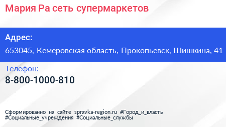 Мария-Ра, сеть супермаркетов по адресу 653045, Кемеровская область, Прокопьевск, Шишкина, 41 в дальнейшем Организация, размещена в следующих категориях: