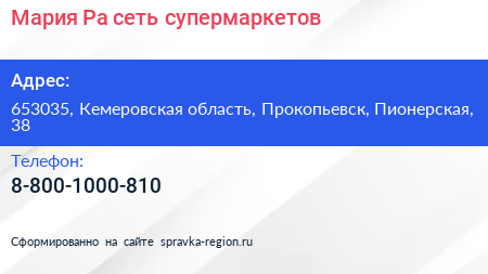 Мария-Ра, сеть супермаркетов по адресу 653035, Кемеровская область, Прокопьевск, Пионерская, 38 в дальнейшем Организация, размещена в следующих категориях: