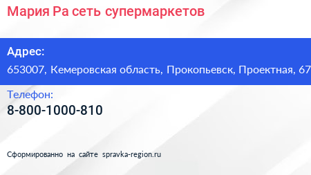 Мария-Ра, сеть супермаркетов по адресу 653007, Кемеровская область, Прокопьевск, Проектная, 67 в дальнейшем Организация, размещена в следующих категориях: