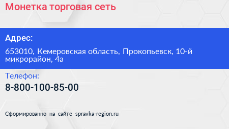 Монетка, торговая сеть по адресу 653010, Кемеровская область, Прокопьевск, 10-й микрорайон, 4а в дальнейшем Организация, размещена в следующих категориях: