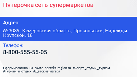 Пятерочка, сеть супермаркетов по адресу 653039, Кемеровская область, Прокопьевск, Надежды Крупской, 18 в дальнейшем Организация, размещена в следующих категориях: