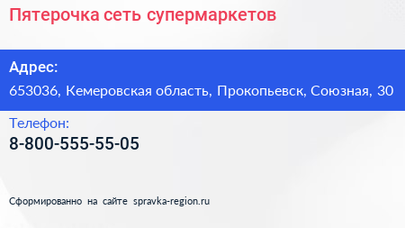 Пятерочка, сеть супермаркетов по адресу 653036, Кемеровская область, Прокопьевск, Союзная, 30 в дальнейшем Организация, размещена в следующих категориях: