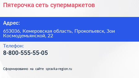 Пятерочка, сеть супермаркетов по адресу 653036, Кемеровская область, Прокопьевск, Зои Космодемьянской, 22 в дальнейшем Организация, размещена в следующих категориях: