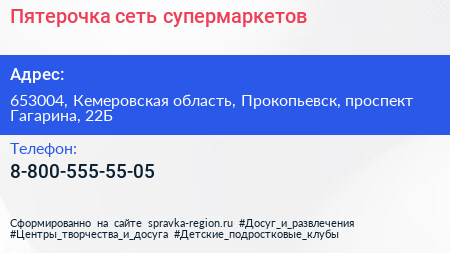 Пятерочка, сеть супермаркетов по адресу 653004, Кемеровская область, Прокопьевск, проспект Гагарина, 22Б в дальнейшем Организация, размещена в следующих категориях: