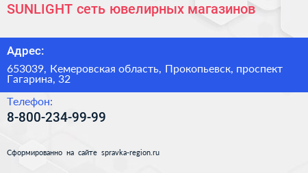 SUNLIGHT, сеть ювелирных магазинов по адресу 653039, Кемеровская область, Прокопьевск, проспект Гагарина, 32 в дальнейшем Организация, размещена в следующих категориях: