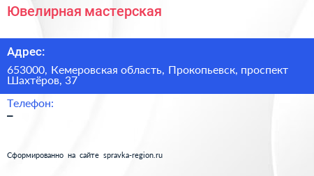 Ювелирная мастерская по адресу 653000, Кемеровская область, Прокопьевск, проспект Шахтёров, 37 в дальнейшем Организация, размещена в следующих категориях: