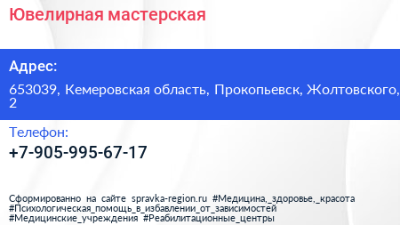 Ювелирная мастерская по адресу 653039, Кемеровская область, Прокопьевск, Жолтовского, 2 в дальнейшем Организация, размещена в следующих категориях: