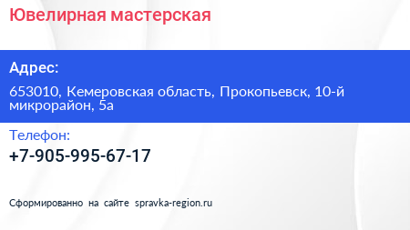 Ювелирная мастерская по адресу 653010, Кемеровская область, Прокопьевск, 10-й микрорайон, 5а в дальнейшем Организация, размещена в следующих категориях: