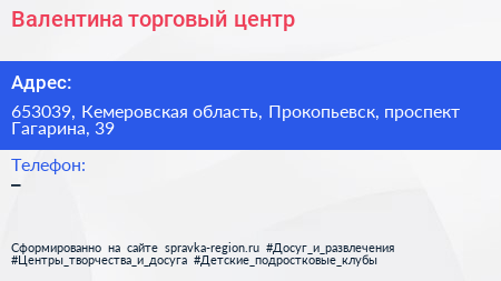 Валентина, торговый центр по адресу 653039, Кемеровская область, Прокопьевск, проспект Гагарина, 39 в дальнейшем Организация, размещена в следующих категориях: