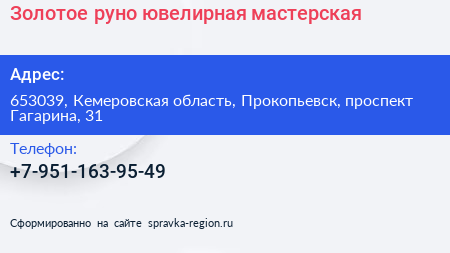 Золотое руно, ювелирная мастерская по адресу 653039, Кемеровская область, Прокопьевск, проспект Гагарина, 31 в дальнейшем Организация, размещена в следующих категориях: