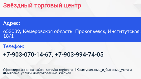 Звёздный, торговый центр по адресу 653039, Кемеровская область, Прокопьевск, Институтская, 18/1 в дальнейшем Организация, размещена в следующих категориях: