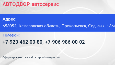 АВТОДВОР, автосервис по адресу 653052, Кемеровская область, Прокопьевск, Седьмая, 136а в дальнейшем Организация, размещена в следующих категориях: