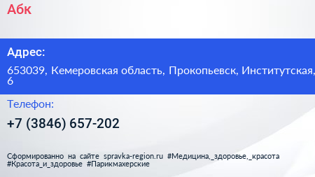 Абк по адресу 653039, Кемеровская область, Прокопьевск, Институтская, 6 в дальнейшем Организация, размещена в следующих категориях: