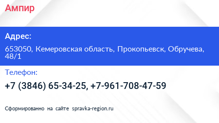 Ампир по адресу 653050, Кемеровская область, Прокопьевск, Обручева, 48/1 в дальнейшем Организация, размещена в следующих категориях: