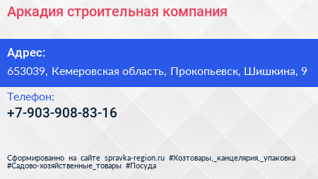 Аркадия, строительная компания по адресу 653039, Кемеровская область, Прокопьевск, Шишкина, 9 в дальнейшем Организация, размещена в следующих категориях:
