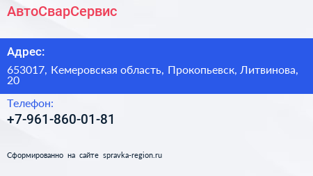 АвтоСварСервис по адресу 653017, Кемеровская область, Прокопьевск, Литвинова, 20 в дальнейшем Организация, размещена в следующих категориях: