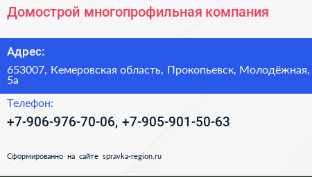 Домострой, многопрофильная компания по адресу 653007, Кемеровская область, Прокопьевск, Молодёжная, 5а в дальнейшем Организация, размещена в следующих категориях: