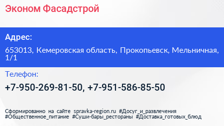 Эконом Фасадстрой по адресу 653013, Кемеровская область, Прокопьевск, Мельничная, 1/1 в дальнейшем Организация, размещена в следующих категориях: