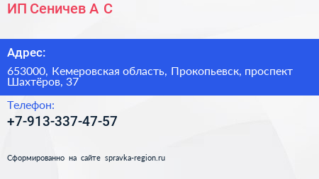 ИП Сеничев А.С. по адресу 653000, Кемеровская область, Прокопьевск, проспект Шахтёров, 37 в дальнейшем Организация, размещена в следующих категориях: