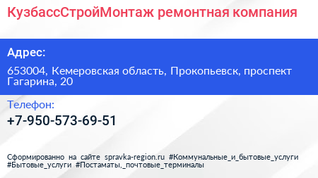 КузбассСтройМонтаж, ремонтная компания по адресу 653004, Кемеровская область, Прокопьевск, проспект Гагарина, 20 в дальнейшем Организация, размещена в следующих категориях: