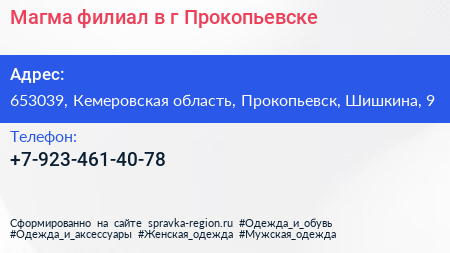 Магма, филиал в г. Прокопьевске по адресу 653039, Кемеровская область, Прокопьевск, Шишкина, 9 в дальнейшем Организация, размещена в следующих категориях: