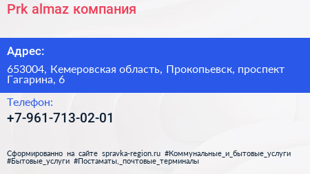 Prk- almaz, компания по адресу 653004, Кемеровская область, Прокопьевск, проспект Гагарина, 6 в дальнейшем Организация, размещена в следующих категориях: