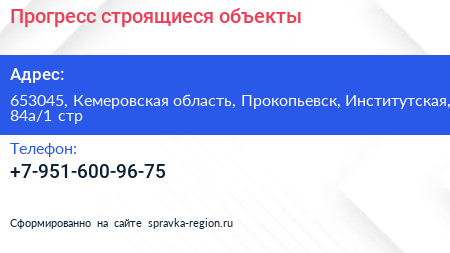Прогресс, строящиеся объекты по адресу 653045, Кемеровская область, Прокопьевск, Институтская, 84а/1 стр в дальнейшем Организация, размещена в следующих категориях: