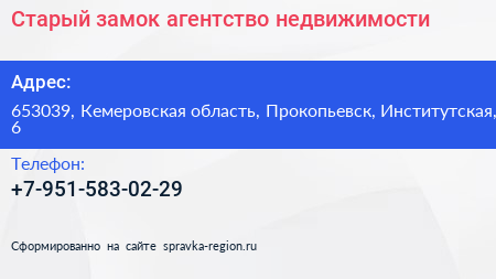 Старый замок, агентство недвижимости по адресу 653039, Кемеровская область, Прокопьевск, Институтская, 6 в дальнейшем Организация, размещена в следующих категориях: