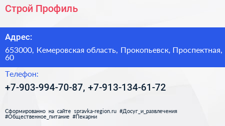 Строй Профиль по адресу 653000, Кемеровская область, Прокопьевск, Проспектная, 60 в дальнейшем Организация, размещена в следующих категориях: