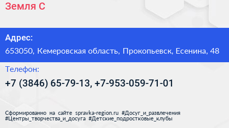Земля-С по адресу 653050, Кемеровская область, Прокопьевск, Есенина, 48 в дальнейшем Организация, размещена в следующих категориях: