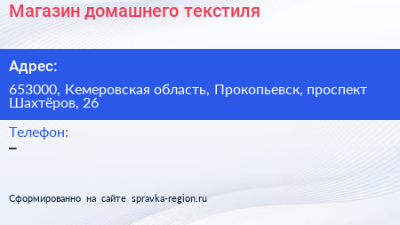 Магазин домашнего текстиля по адресу 653000, Кемеровская область, Прокопьевск, проспект Шахтёров, 26 в дальнейшем Организация, размещена в следующих категориях: