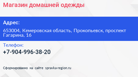 Магазин домашней одежды по адресу 653004, Кемеровская область, Прокопьевск, проспект Гагарина, 16 в дальнейшем Организация, размещена в следующих категориях: