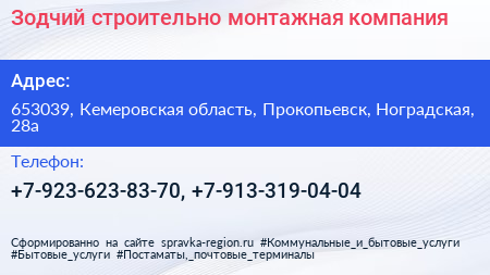 Зодчий, строительно-монтажная компания по адресу 653039, Кемеровская область, Прокопьевск, Ноградская, 28а в дальнейшем Организация, размещена в следующих категориях: