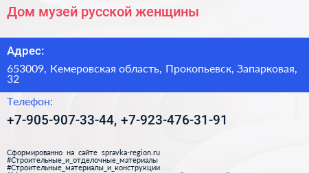 Дом-музей русской женщины по адресу 653009, Кемеровская область, Прокопьевск, Запарковая, 32 в дальнейшем Организация, размещена в следующих категориях: