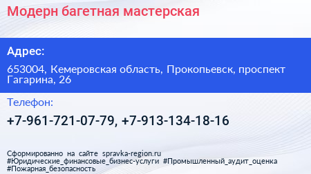 Модерн, багетная мастерская по адресу 653004, Кемеровская область, Прокопьевск, проспект Гагарина, 26 в дальнейшем Организация, размещена в следующих категориях: