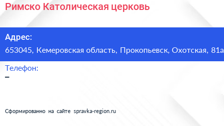 Римско-Католическая церковь по адресу 653045, Кемеровская область, Прокопьевск, Охотская, 81а в дальнейшем Организация, размещена в следующих категориях: