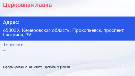 Церковная лавка по адресу 653039, Кемеровская область, Прокопьевск, проспект Гагарина, 39 в дальнейшем Организация, размещена в следующих категориях: