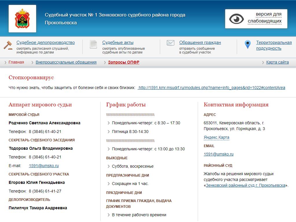 Мировые судьи Зенковского района г. Прокопьевска по адресу 653000, Кемеровская область, Прокопьевск, Горняцкая, 3 в дальнейшем Организация, размещена в следующих категориях: