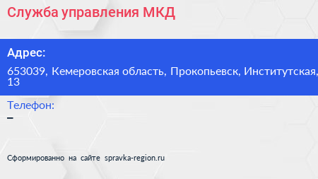 Служба управления МКД по адресу 653039, Кемеровская область, Прокопьевск, Институтская, 13 в дальнейшем Организация, размещена в следующих категориях: