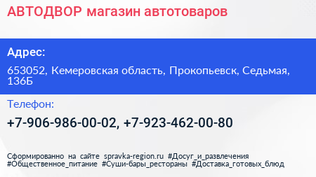 АВТОДВОР, магазин автотоваров по адресу 653052, Кемеровская область, Прокопьевск, Седьмая, 136Б в дальнейшем Организация, размещена в следующих категориях:
