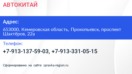 АВТОКИТАЙ по адресу 653000, Кемеровская область, Прокопьевск, проспект Шахтёров, 22а в дальнейшем Организация, размещена в следующих категориях: