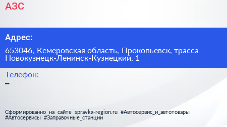 АЗС по адресу 653046, Кемеровская область, Прокопьевск, трасса Новокузнецк-Ленинск-Кузнецкий, 1 в дальнейшем Организация, размещена в следующих категориях: