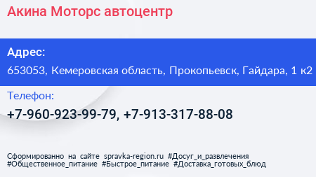 Акина Моторс, автоцентр по адресу 653053, Кемеровская область, Прокопьевск, Гайдара, 1 к2 в дальнейшем Организация, размещена в следующих категориях: