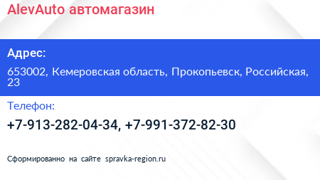 AlevAuto, автомагазин по адресу 653002, Кемеровская область, Прокопьевск, Российская, 23 в дальнейшем Организация, размещена в следующих категориях: