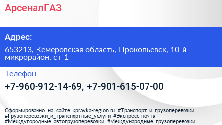 АрсеналГАЗ по адресу 653213, Кемеровская область, Прокопьевск, 10-й микрорайон, ст 1 в дальнейшем Организация, размещена в следующих категориях: