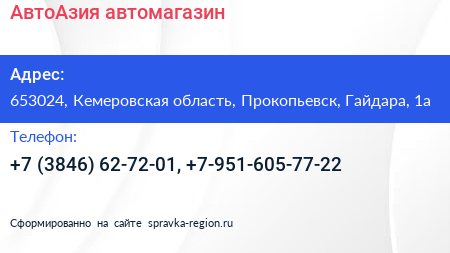 АвтоАзия, автомагазин по адресу 653024, Кемеровская область, Прокопьевск, Гайдара, 1а в дальнейшем Организация, размещена в следующих категориях: