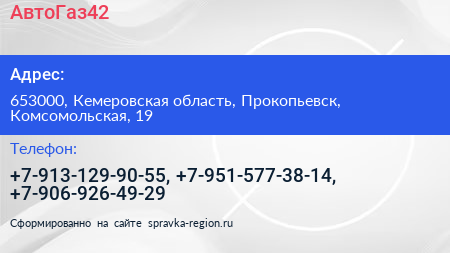 АвтоГаз42 по адресу 653000, Кемеровская область, Прокопьевск, Комсомольская, 19 в дальнейшем Организация, размещена в следующих категориях:
